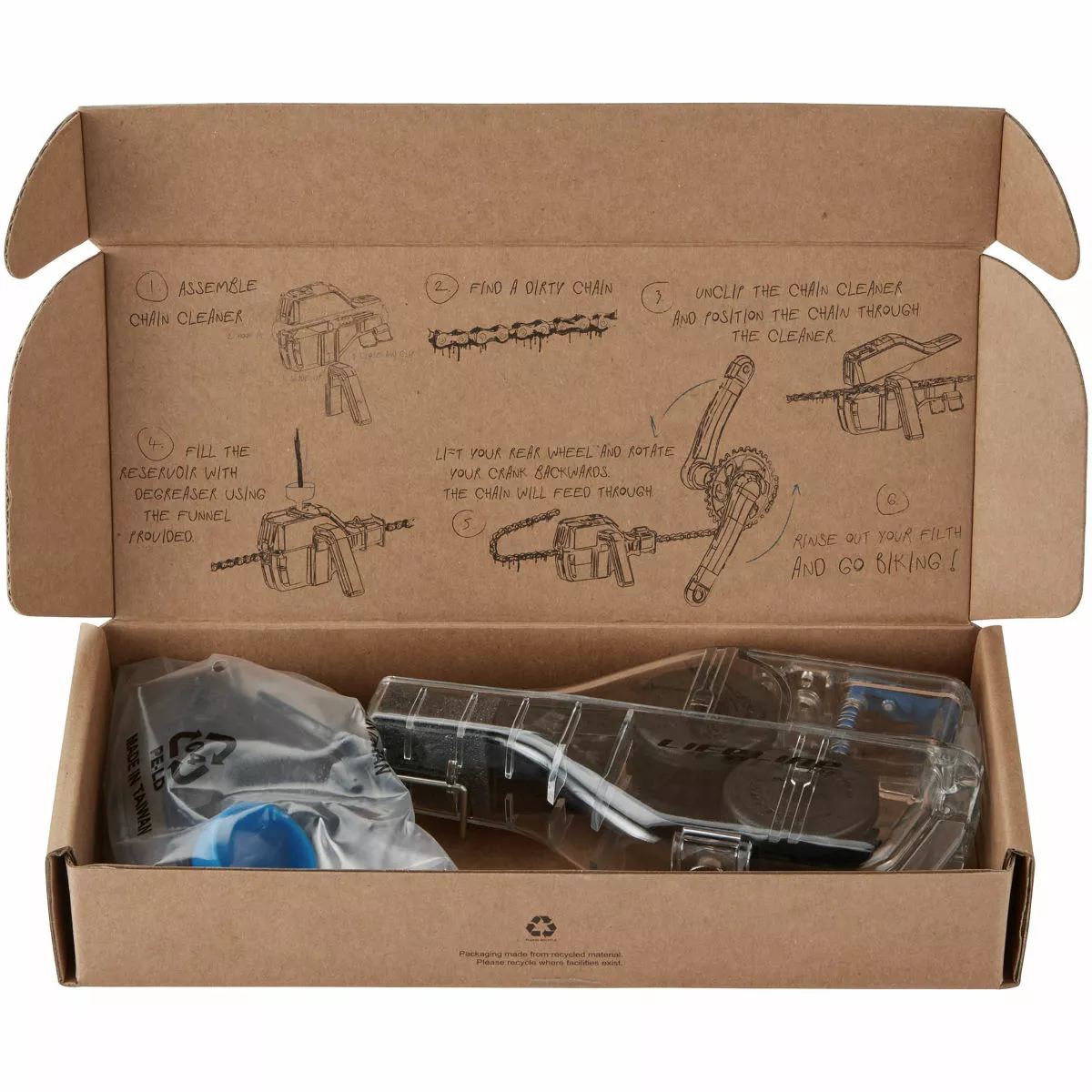 Clip the cleaner over your chain and fill the cleaner with degreaser. The independant reservoir prevents the recirculation of dirty degreaser and allows you to gradually dispense. The chain passes through 2 roller brushes with multi directional bristles giving your chain a top and bottom clean.
