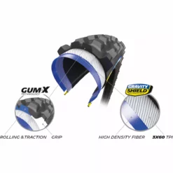 The rubber compounds and casings of these tyres were previously tested in top-level Enduro racing and have been designed to offer the optimal balance between grip, rolling efficiency, longevity, weight and damage resistance. The dual-compound GUM-X Technology features a harder centre area for optimum rolling efficiency and tyre life, combined with softer rubber on the shoulders for cornering grip. The Gravity Shield Technology casing uses a bead-to-bead high-density fibre for increased resistance to impact damage, sidewall cuts and punctures, coupled with a 3×60 TPI casing for stiffness and stability, while still maintaining good comfort levels.