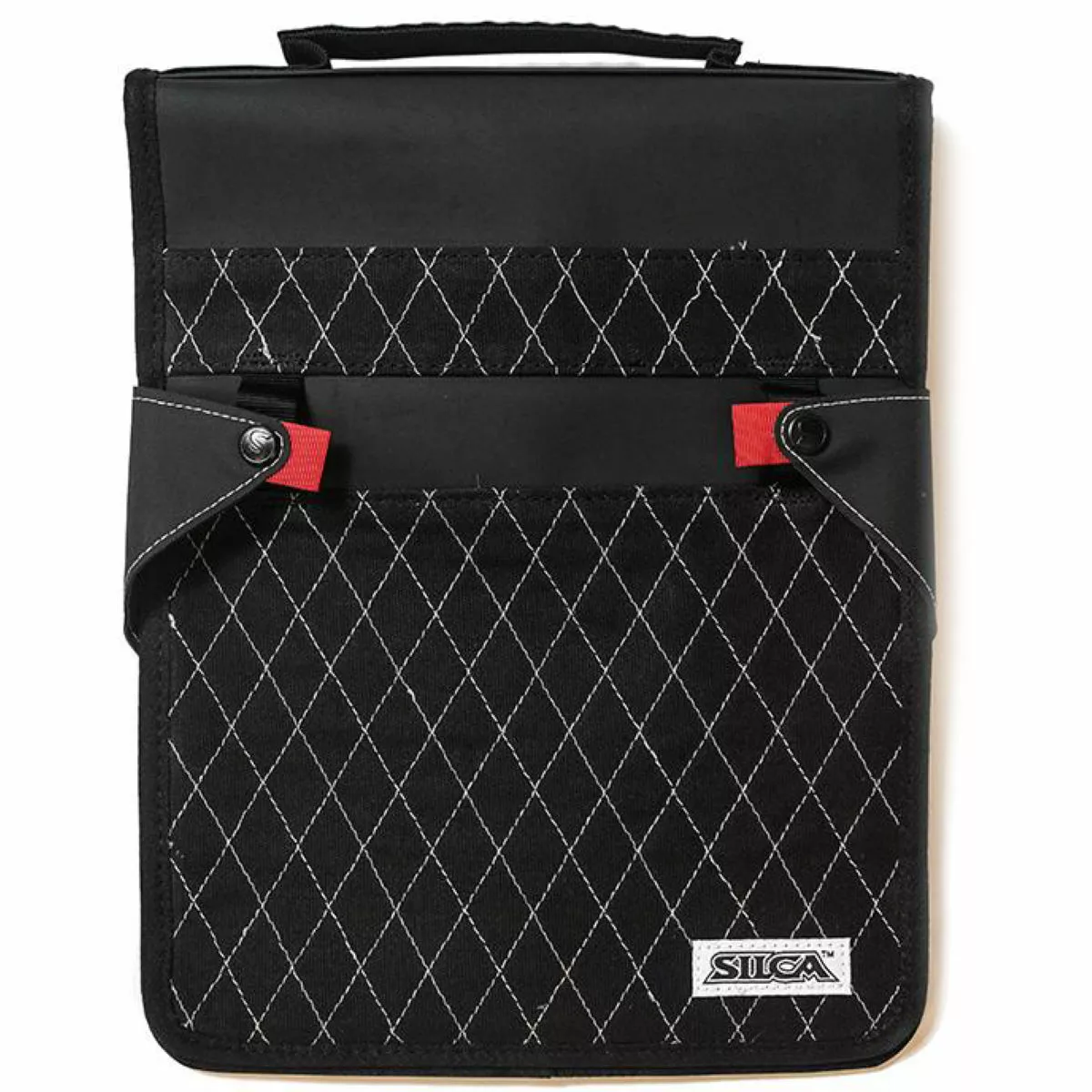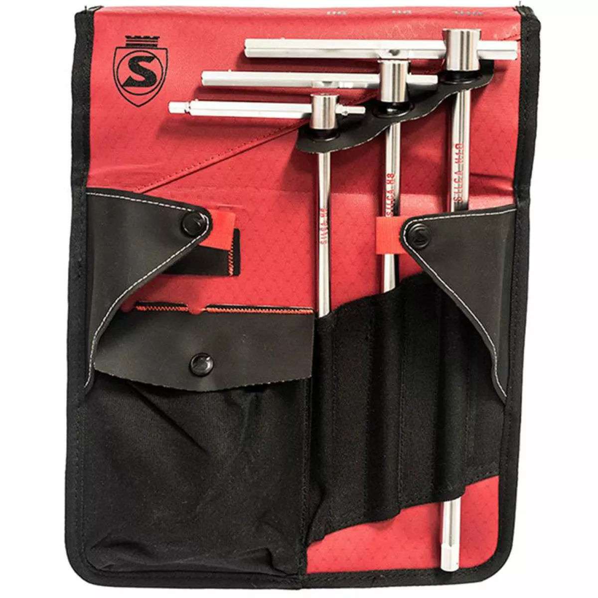 Handily held in a 12oz Waxed Duck Canvas folding holster, the T-Handle Folio Kit lets you quickly and easily pick up and replace each tool in their individually marked compartments for top-notch efficiency. The bag is protected by a computer-quilted exterior featuring Silca’s recognisable diamond pattern, sewn with reflective thread for easy recognition. Made from rip-stop nylon and a rugged gripping Dupont Hypalon, it can be easily hung or draped on horizontal-to-overhanging surfaces for simple access.Â