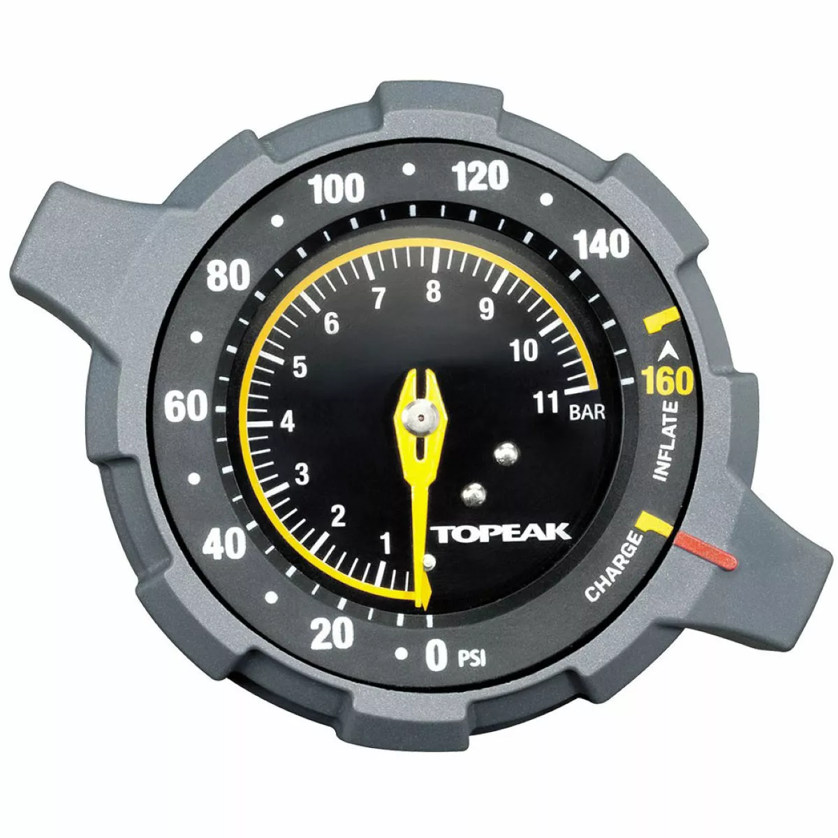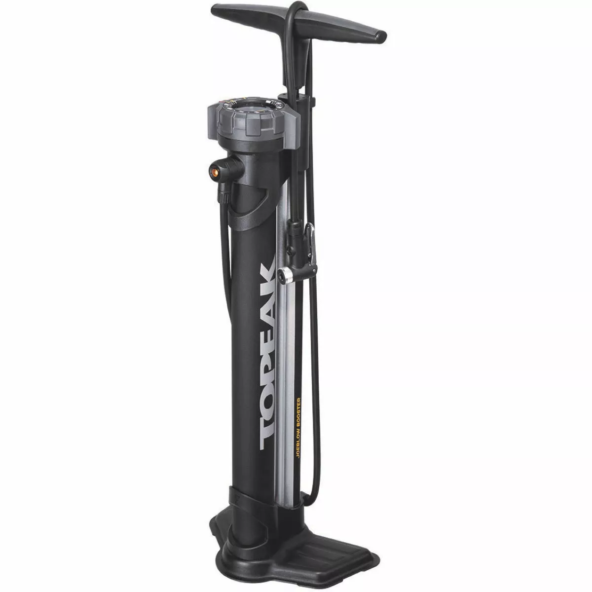 Once you flip this Topeak Joe Blow track pump’s selector from “charge” to “inflate” mode, air bypasses the chamber and flows directly into your tyre like a standard pump. The top-mounted easy-to-read gauge, air release button and comfortable dual density polymer grip, combined with its extra-long hose and a stable base makes mounting tubeless and standard tyres a breeze.