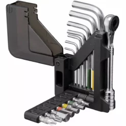 This elegant and dependable set features a quality ratchet, 7 ratchet bits, 7 ball-end Allen wrenches that are all stored in an innovative folding organiser body.Â