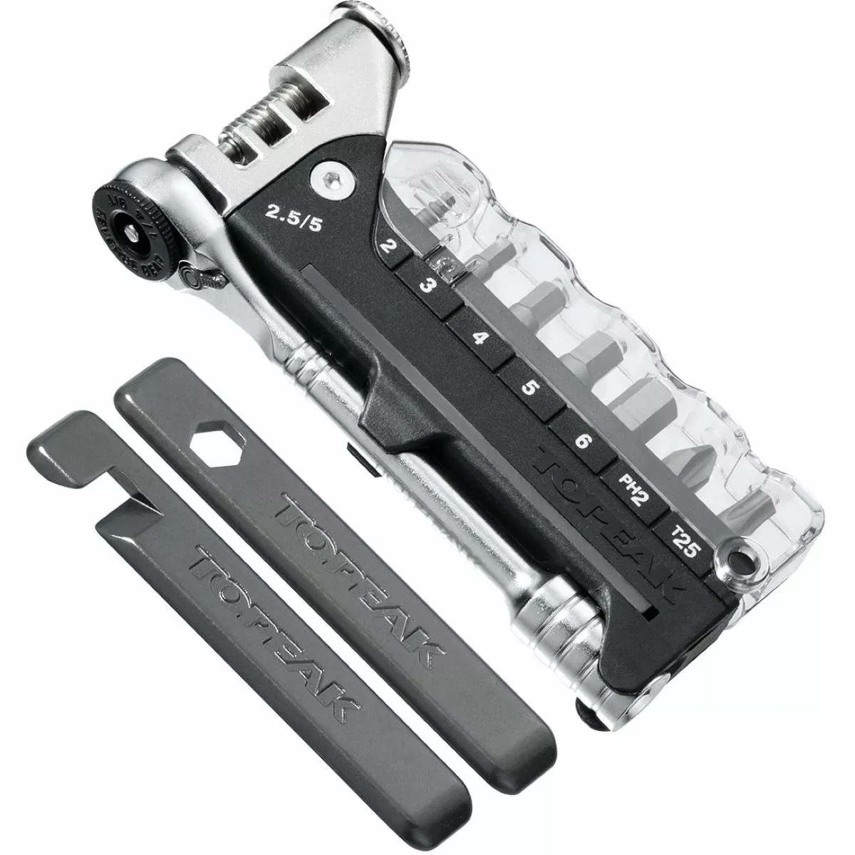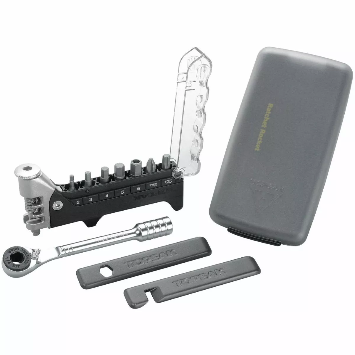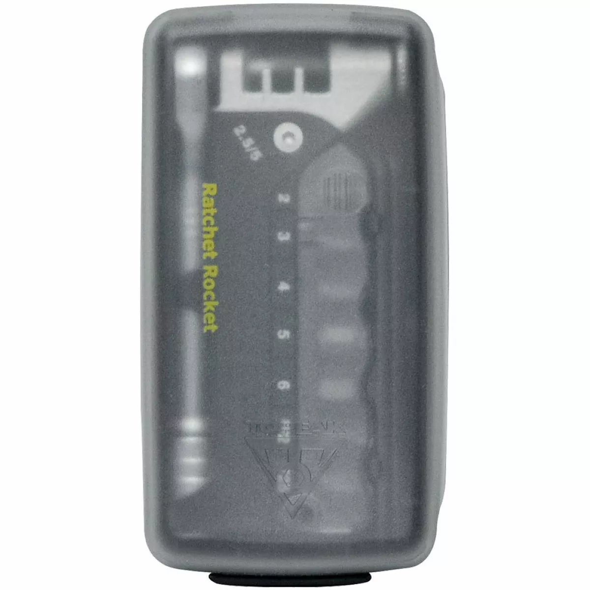 The Ratchet Rocket features a fine tooth ratchet mechanism with reverse lever and thumb wheel for quick rotation and control in tight spots and includes hardened tool steel 2, 2.5, 3, 4, 5, 6mm hex, #2 Phillips and 25 Torx bits. Ratchet tool snaps into an integrated chain tool and bit storage box.