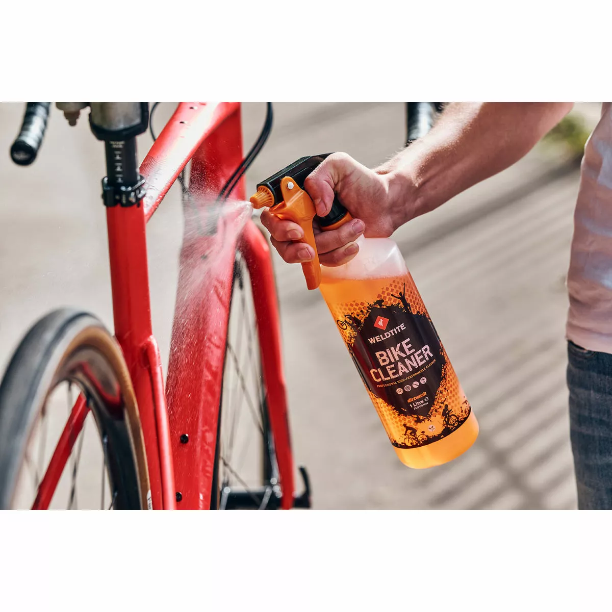 Spray the whole bike to bring a sparkle back to the paintwork and any polished metal parts. Then rinse with clean water.