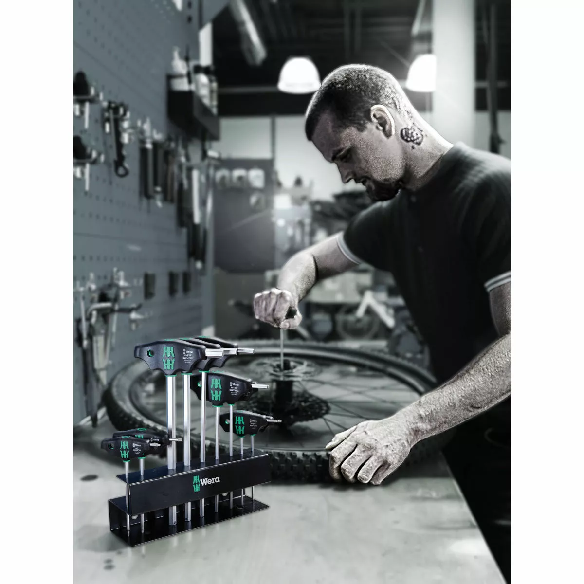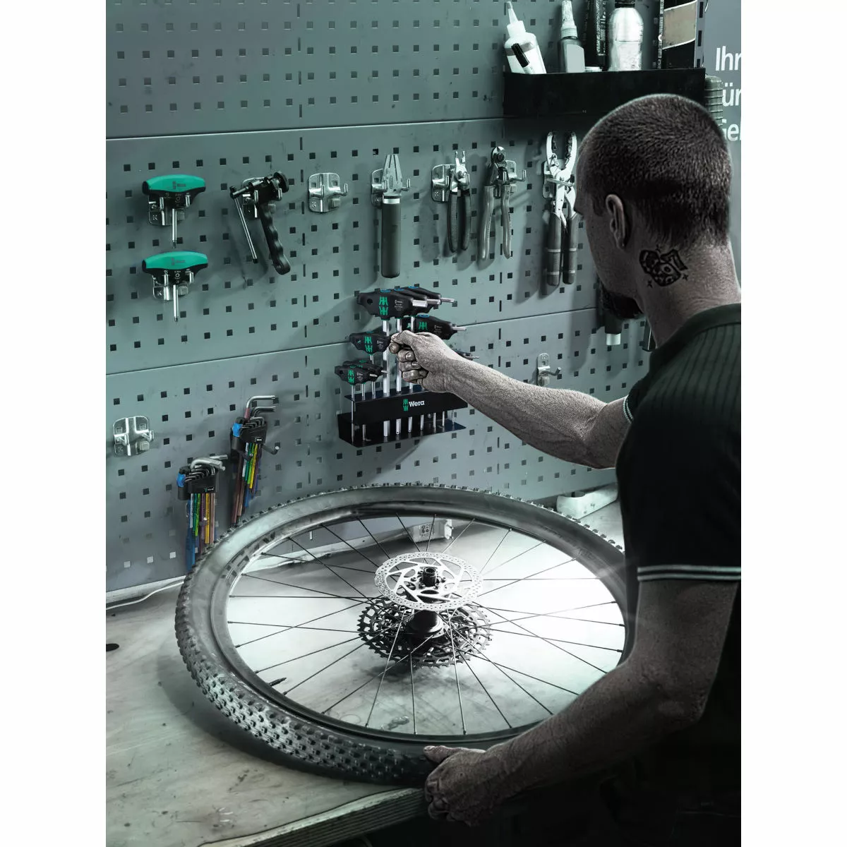 This toolset is a beneficial addition to any workshop, home work shed or garage. Tool specialist Wera presents Bicycle Set 6, a 10-piece T-Shaped Hex and Torx Key set for bicycle workshop maintenance and repairs. Supplied with a metal rack for clearly arranged storage in the workshop, this set is suitable for road, mountain bikes (MTB) and electric bikes (E-Bike).